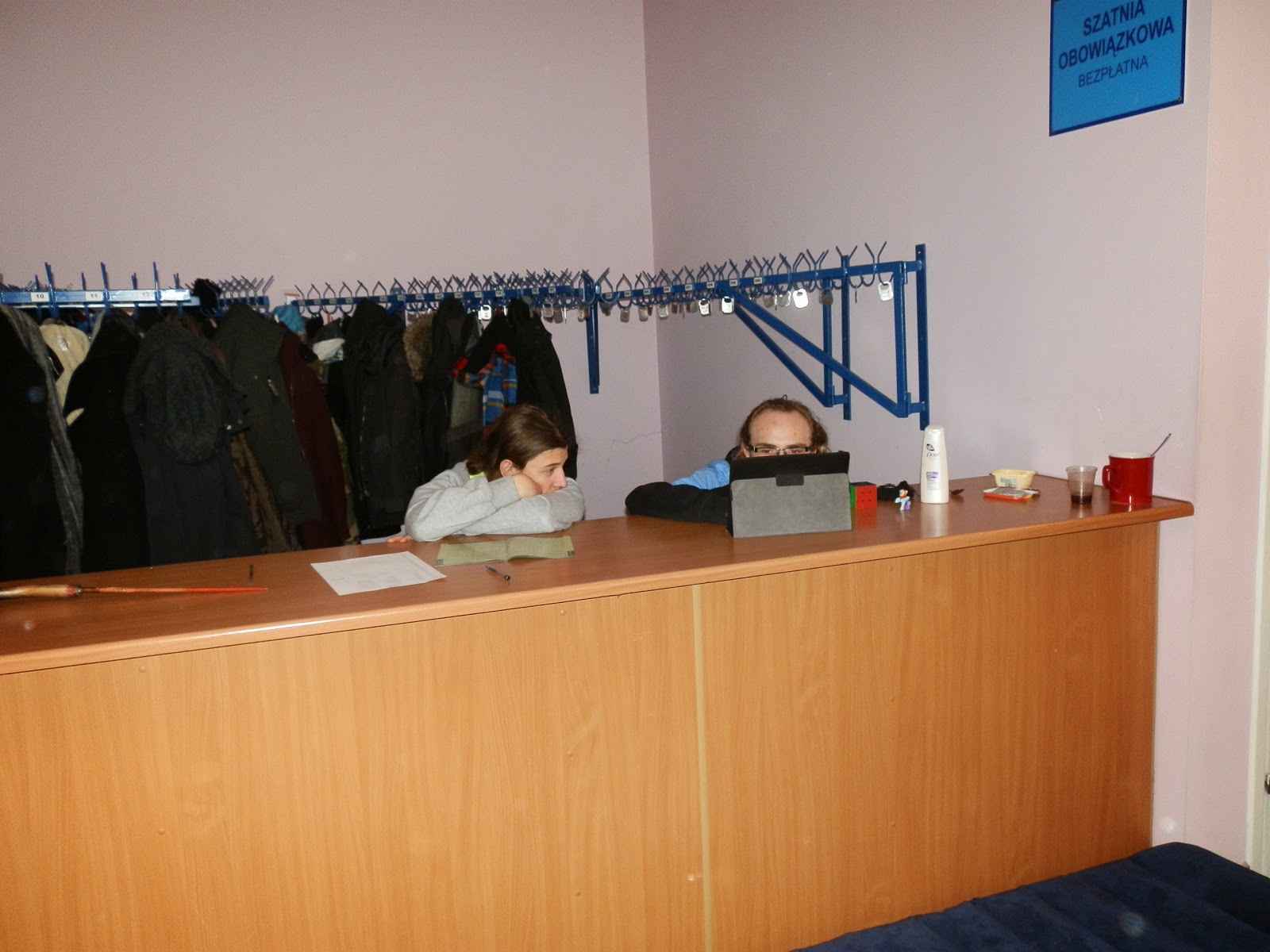Do Wrocławia dotarliśmy o godzinie 9:50. Szybko udało nam się zlokalizować odpowiedni tramwaj (przy drobnej pomocy „telefonu do przyjaciela" ;-) ). Po przebyciu ok 7 przystanków dotarliśmy na conplace. Spory, 4 piętrowy budynek z gigantycznym napisem „Edukacja" na dachu ciężko przeoczyć. Kolejka była malutka, ale też przybyliśmy w czasie kiedy zwykle i tak mało kto się akredytuje ^^. Po okazaniu dowodu i wpisaniu się na listę atrakcjonistów dostałem mały kwadratowy kartonik koloru pomarańczowego z grafiką przewodnią. Do wyboru jeszcze miałem żółtą dla atrakcjonistów. Udało mi się podpatrzeć także zielone. Informator był drukowany na cienkim papierze. W środku nie znalazłem regulaminu! Za to reszta, czyli opisy i tabela programowa były przejrzyste i jasne. Wyruszyłem do drugiego budynku sleepowego, który znajdował się 5 metrów za szkołą konwentową. Był to prawie całkiem przeszklony - dwuskrzydłowy budyneczek. Po wejściu zostaliśmy skontrolowani (opaski). Naprzeciwko znajdowała się lada z dwoma helperami w środku - szatnia ;-). Po obu stronach dwa pomieszczenia sleepowe w formacie ok 10x10 metrów wypchane po brzegi... Trochę mało miejsca dla tak wielkiej liczby uczestników... Po powrocie do głównego conplace'u znalazłem także osobny sleeproom dla atrakcjoistów/mediów i jeszcze dwa inne, niemal puste.